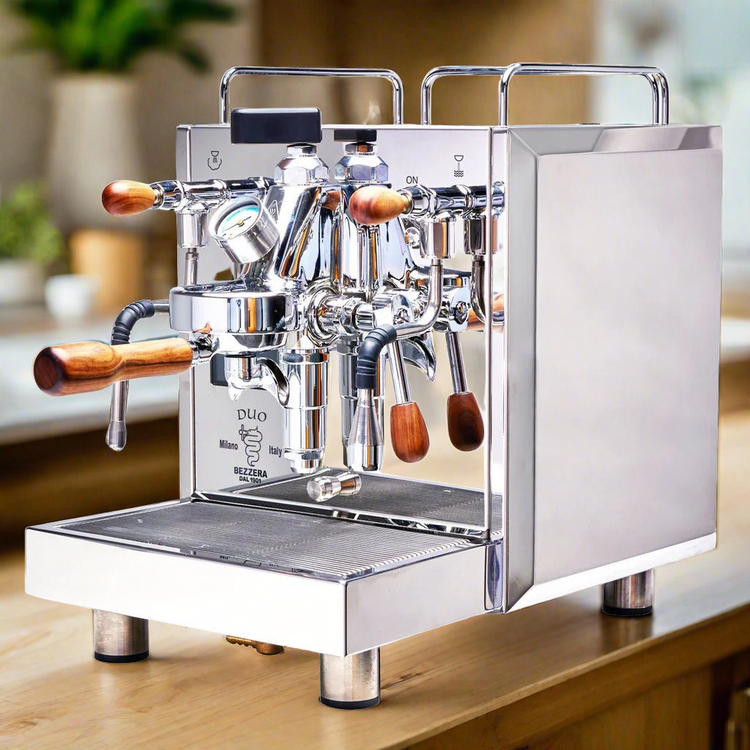 The Bezzera Duo features a stainless steel body and rosewood detailing, providing an instant classic look. It shares many of the same features as the Matrix, including a vibrant touch screen display for managing the dual PIDs; each disciplines the boiler's current temperature and brew temperature separately. Automatic on/off and switch from reservoir to plumbed operation, as well as maintenance cycles and notifications for insufficient water or filter replacement are supported. Additionally, the 3.5" touchscreen allows greater temperature stability with the traditional E61 group syphon. Pre-infusion is enabled via a lever system, and push buttons and toggles make brewing easy. The rosewood steam knob provides powerful steaming and locking for uninterrupted stream. With the DUO DE model, the advanced features include PIDs for boiler temps, brew and head temps, as well as a volumetric brewing option with four programmable shot volumes.
